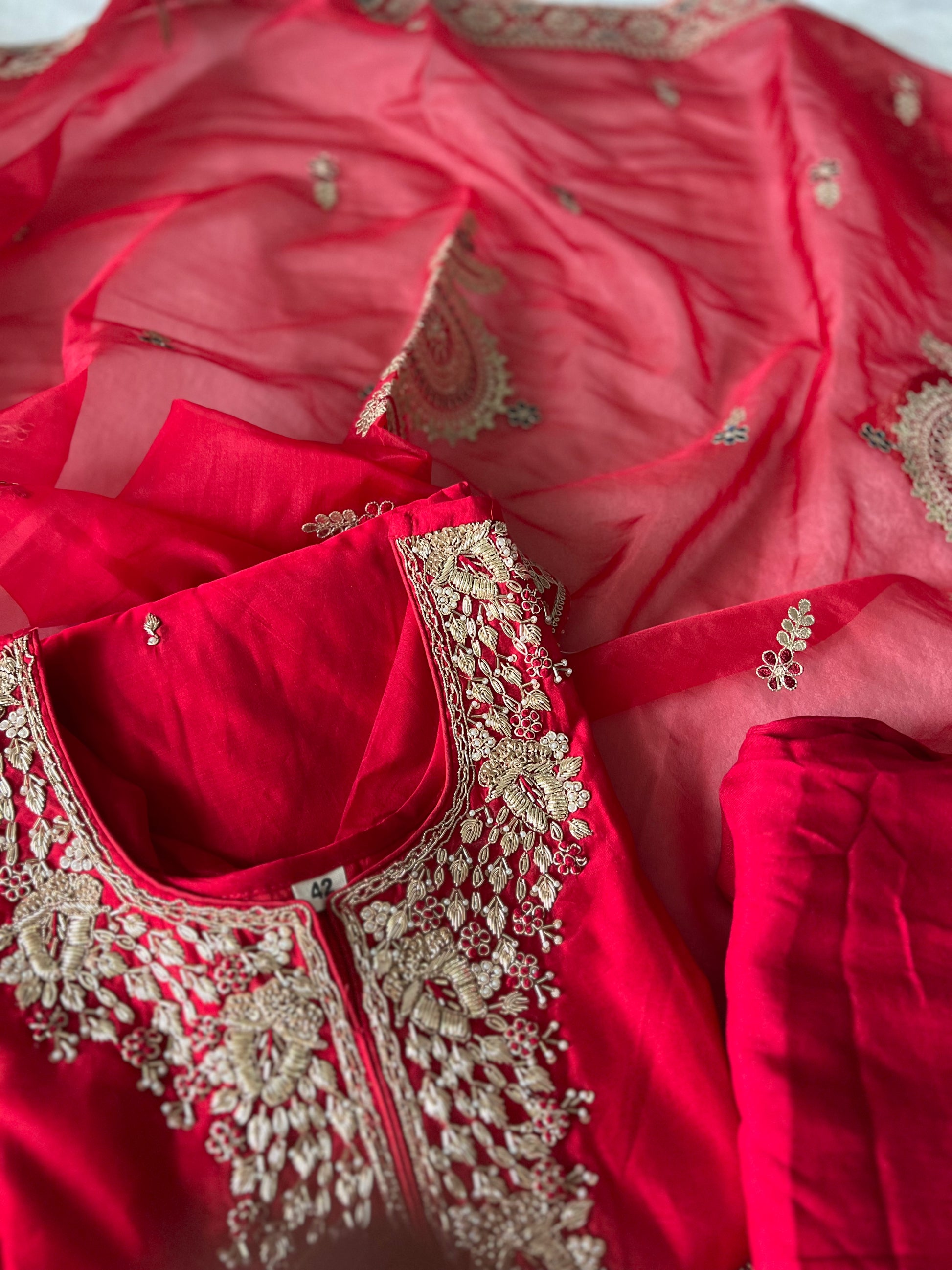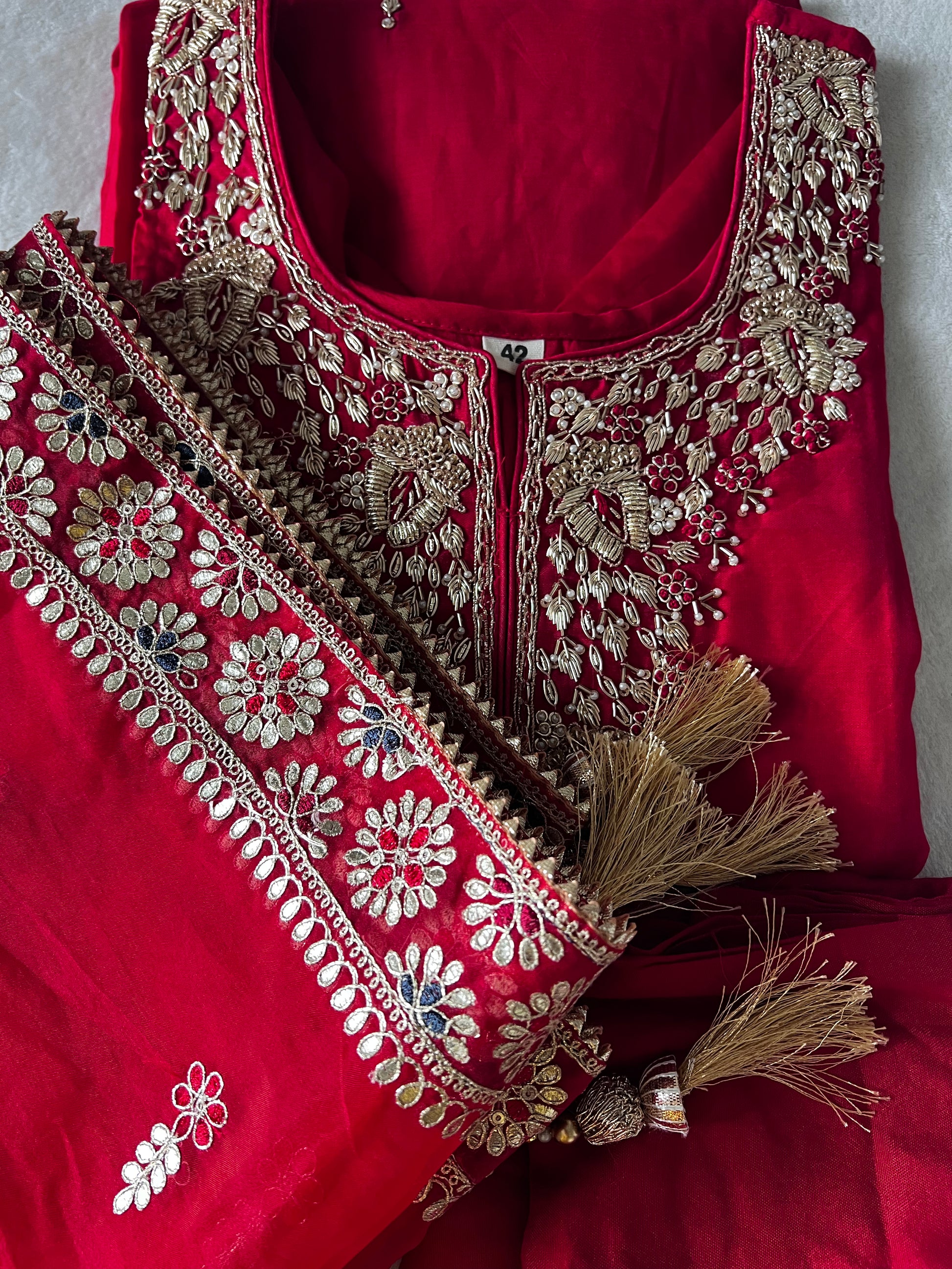 Beautiful designer wear heavy handwork red kurti set with organza dupatta