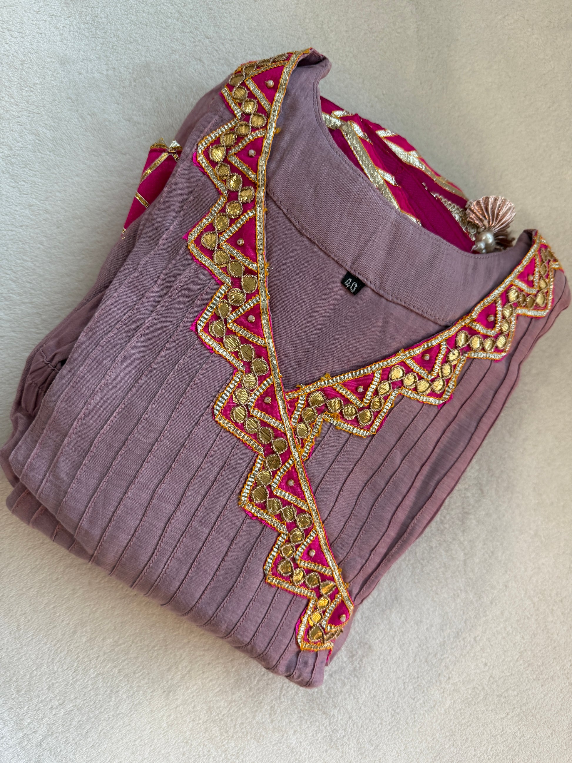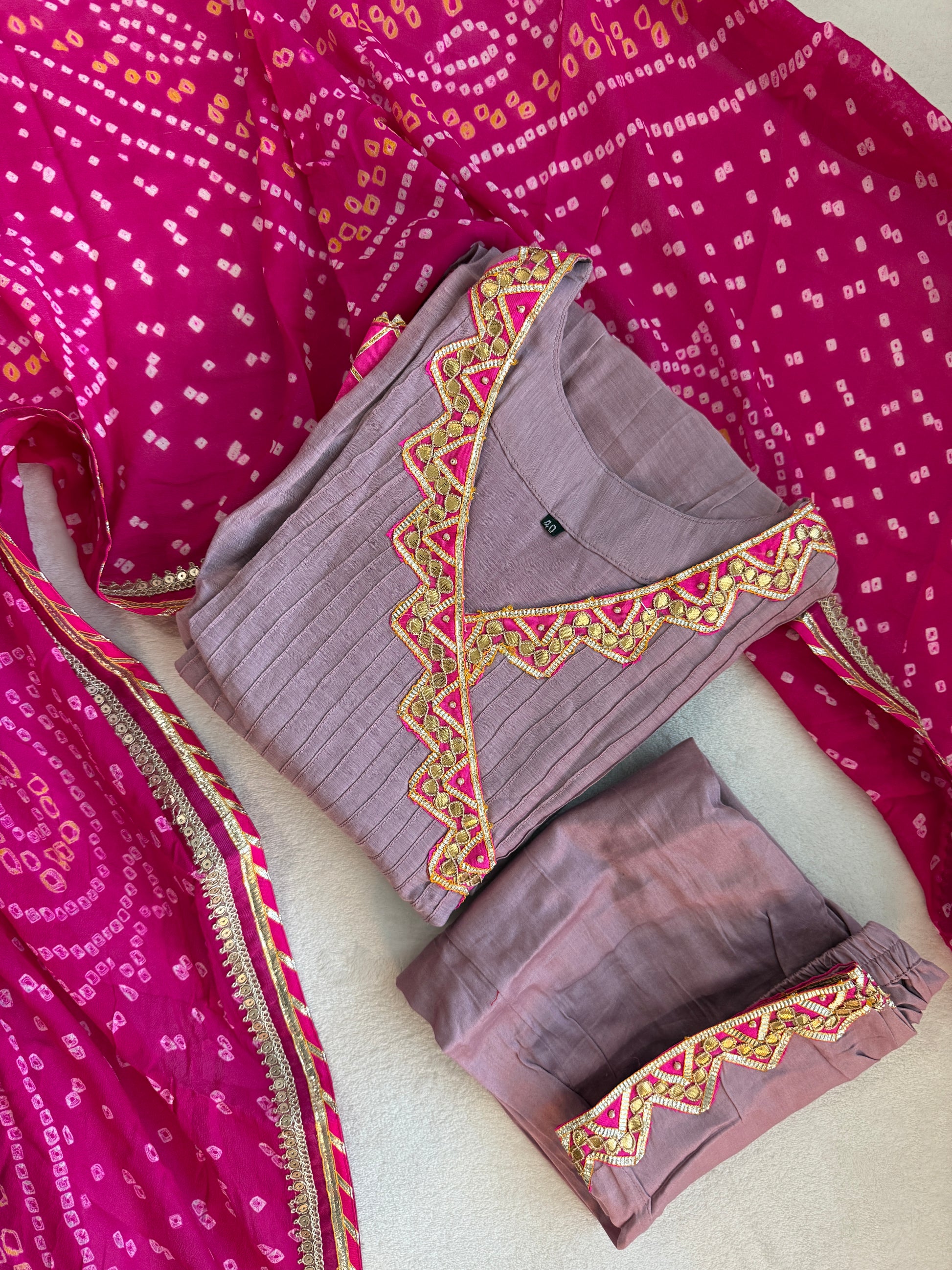 Lilac shade mul chanderi angrakha pattern kurti set with beautiful bandhini dupatta