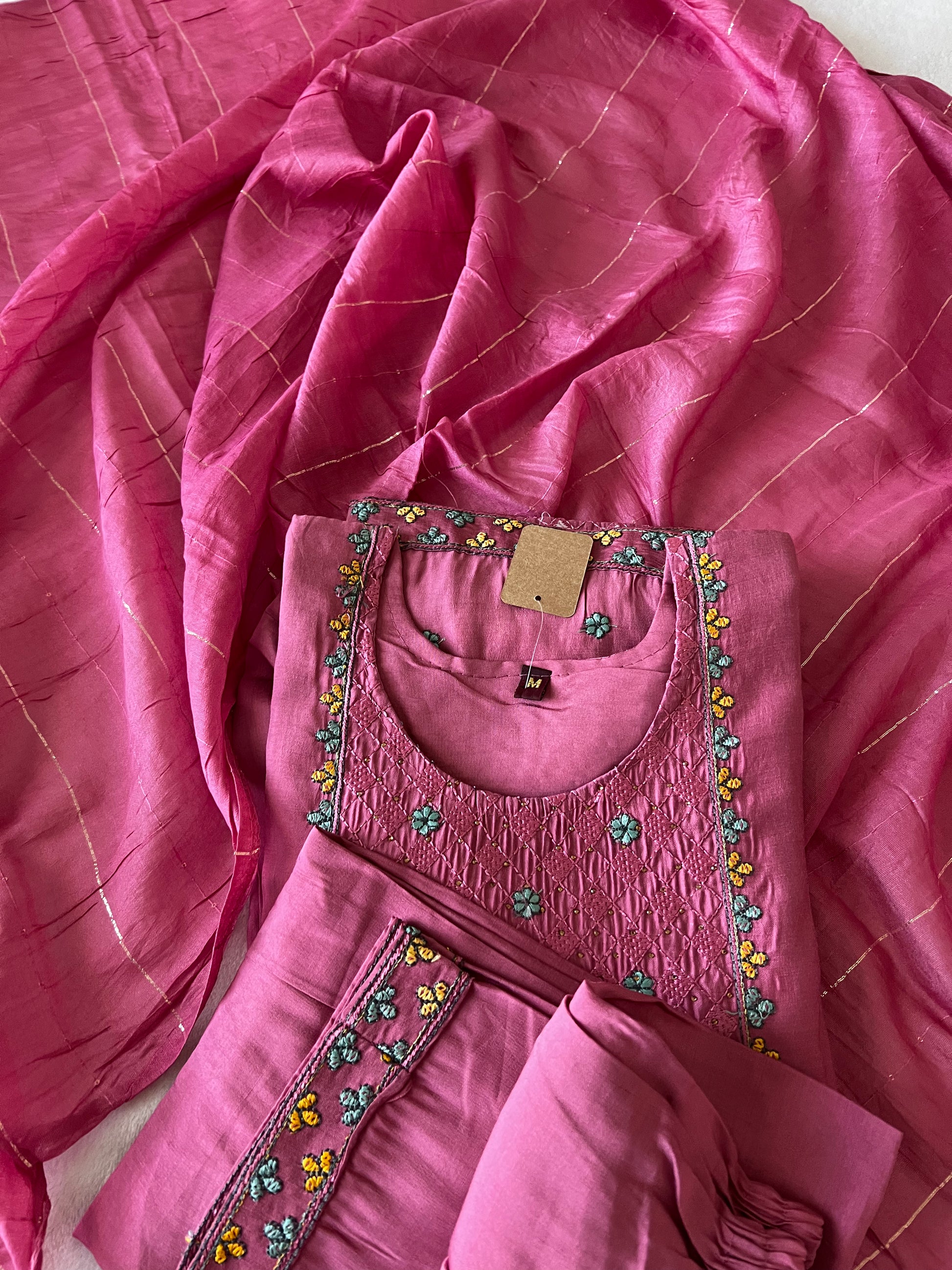 Mauve pink floral embroidery elegant kurti set with beautiful sequin dupatta
