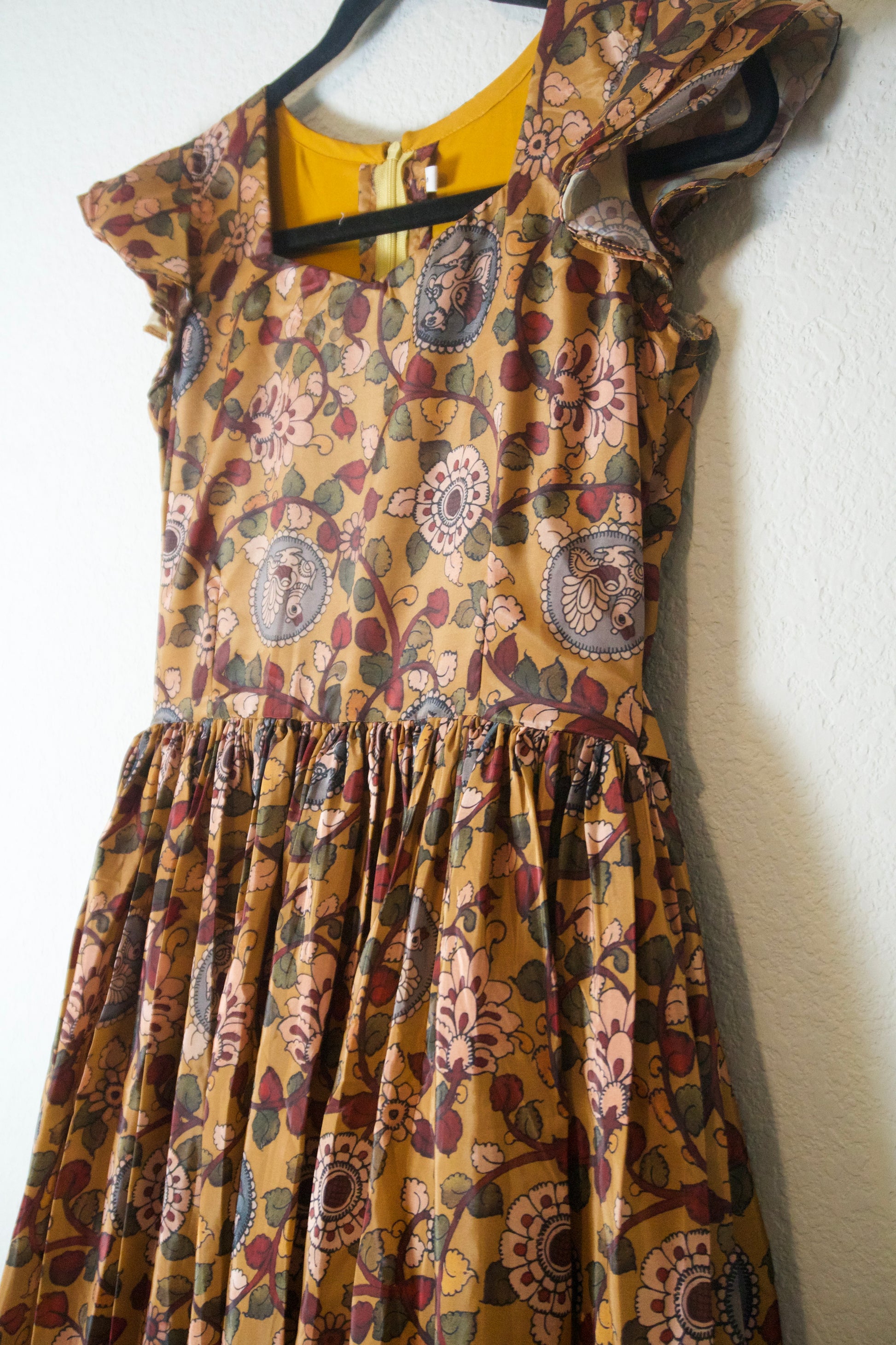 Mustard Yellow Kalamkari Silk Sleeveless Style Frock Scalloped Flare