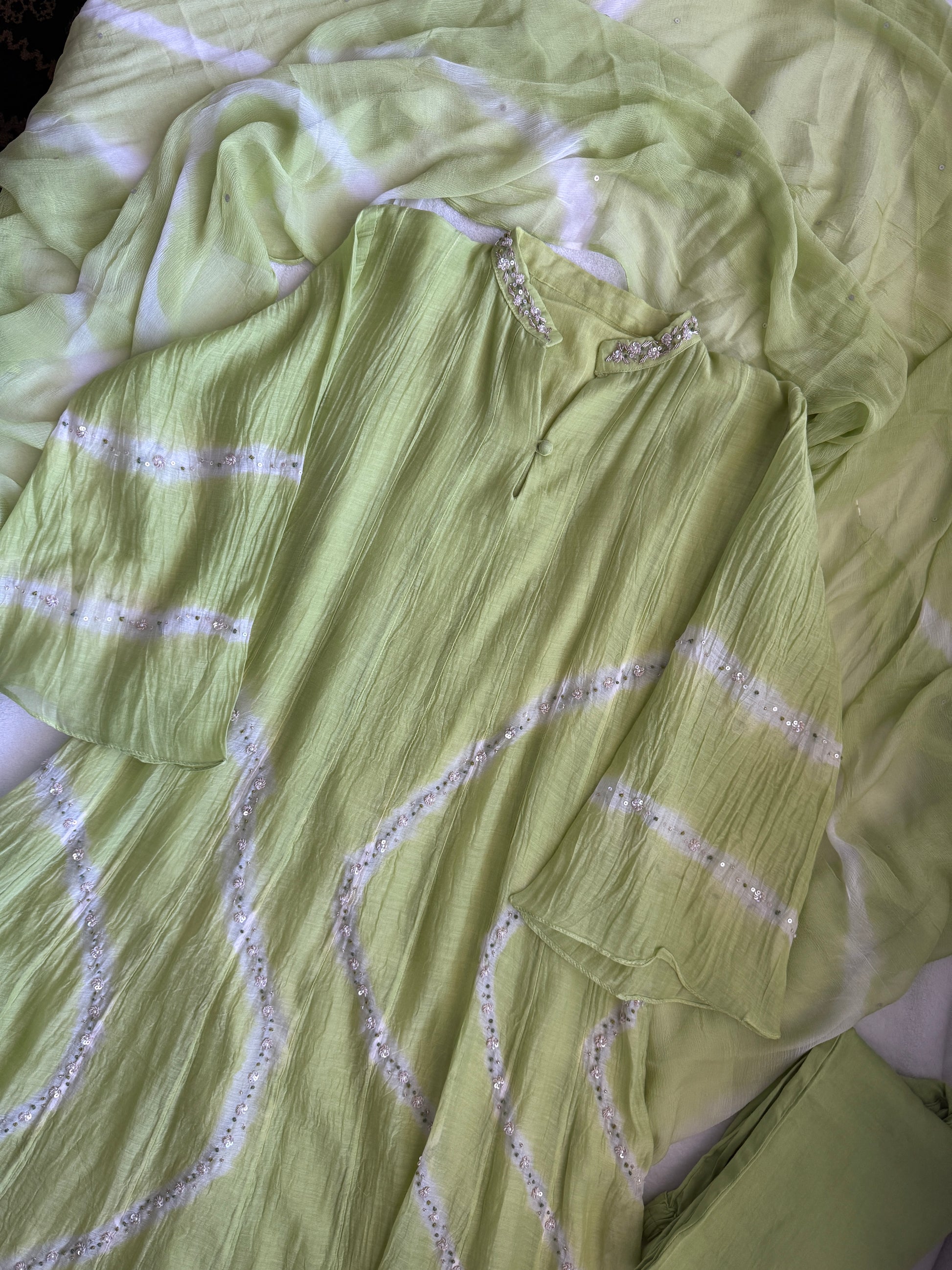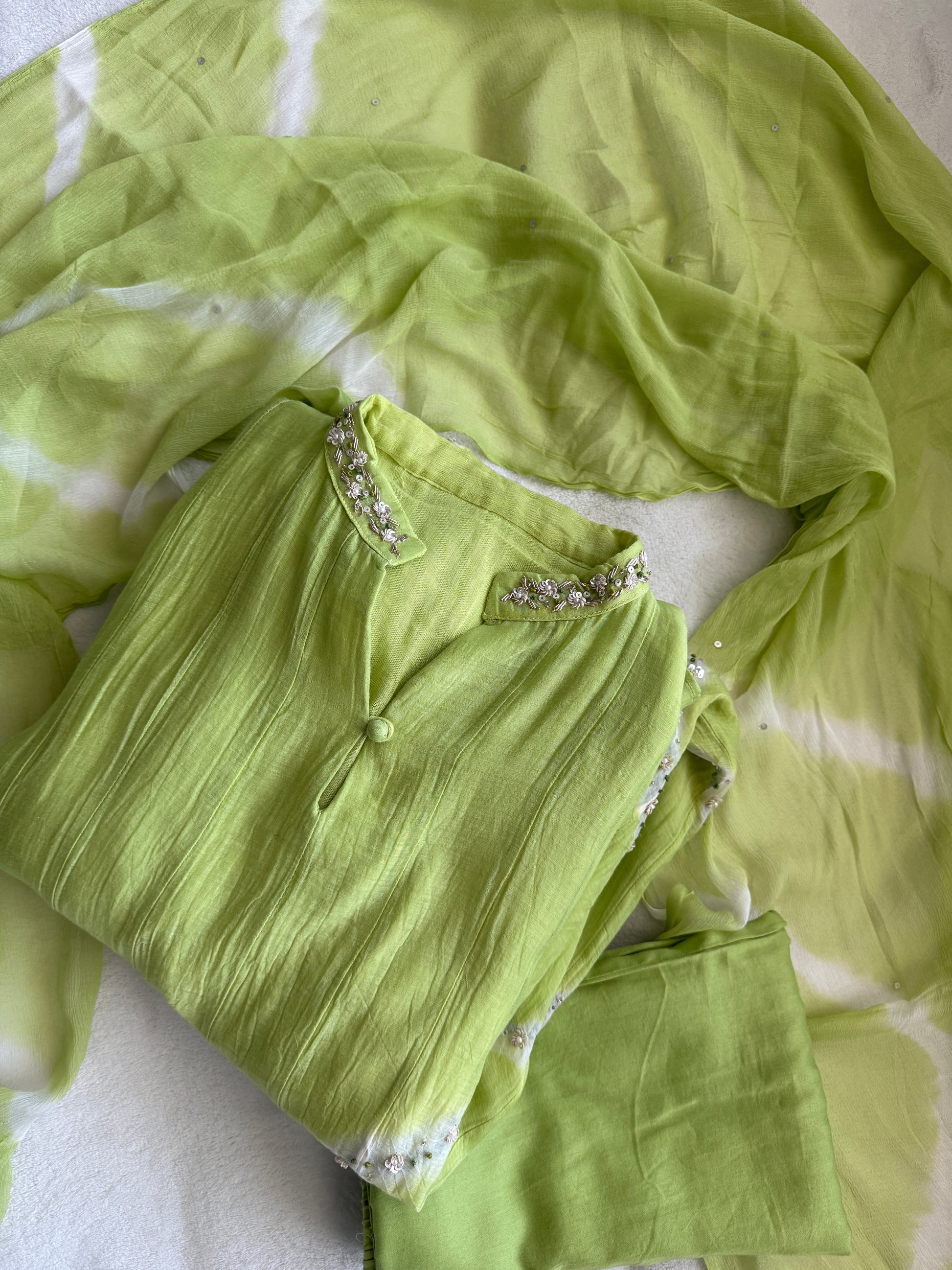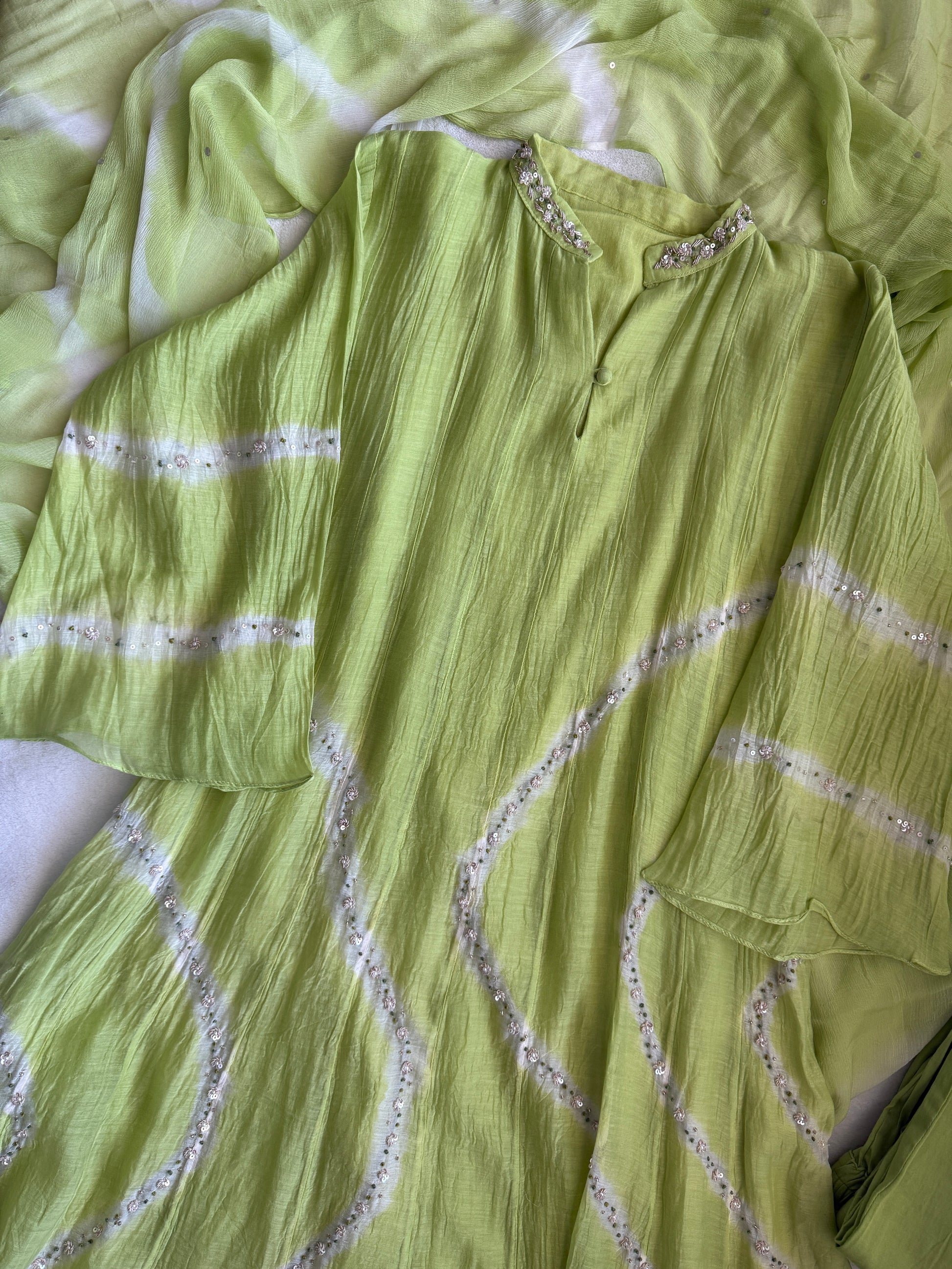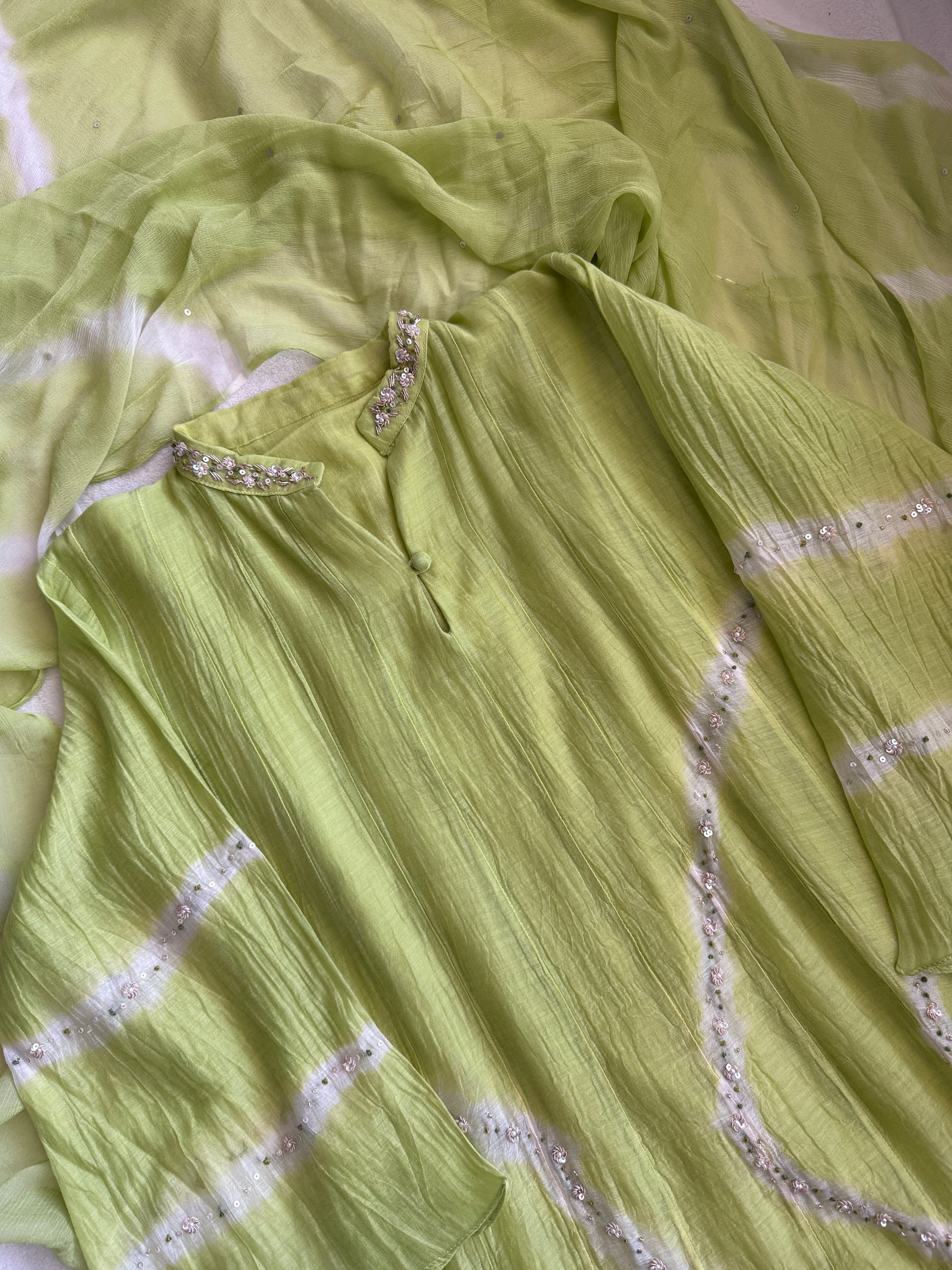Parrot green mul chanderi A-line kurti set with chiffon dupatta