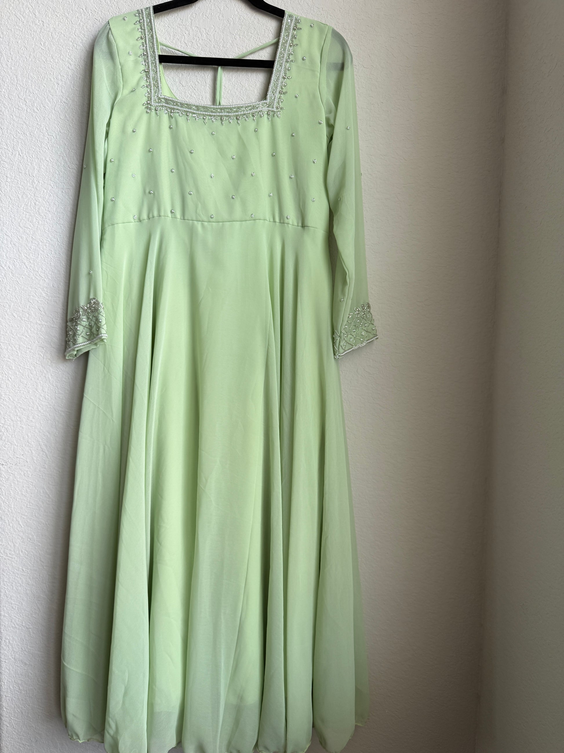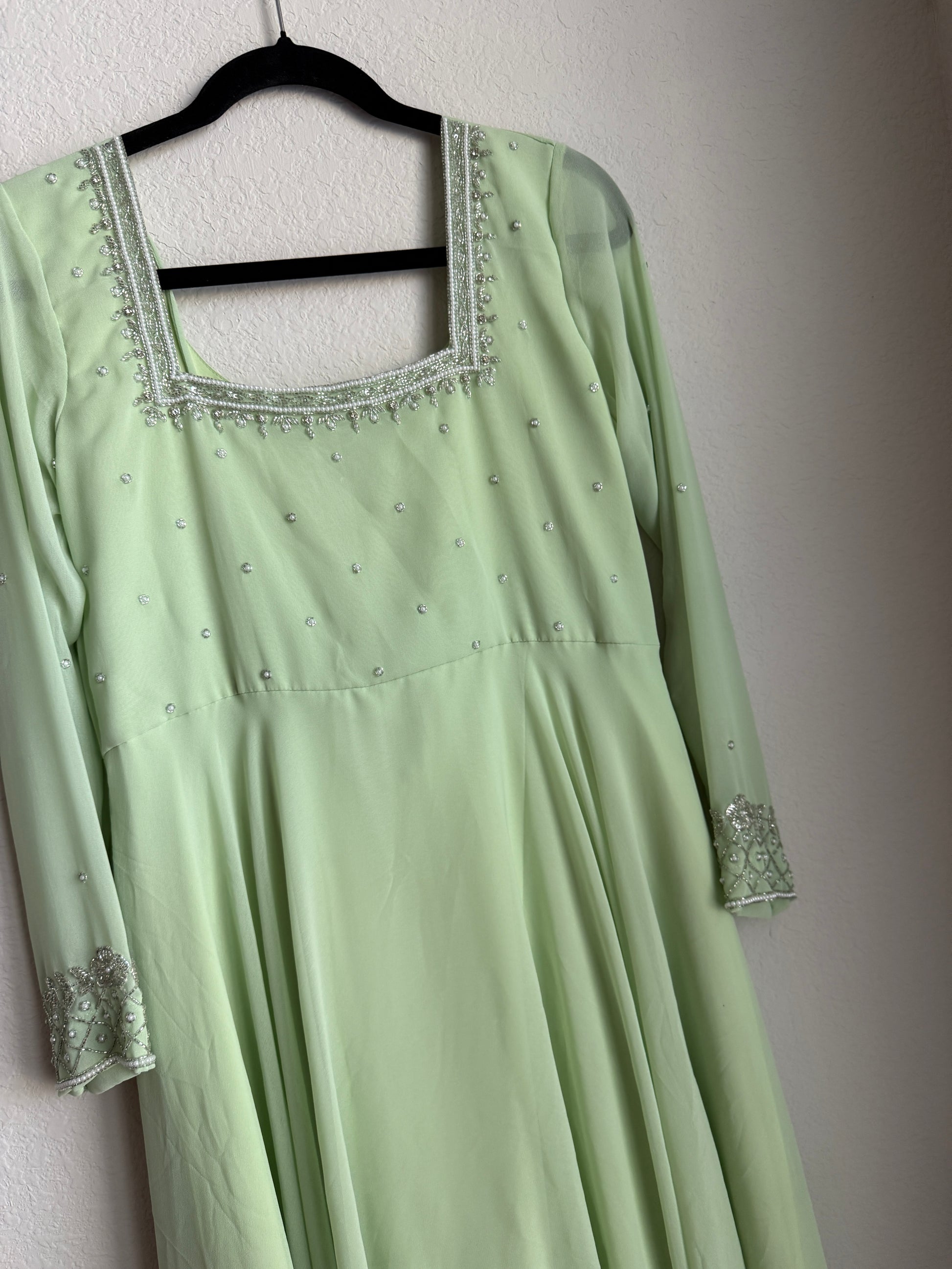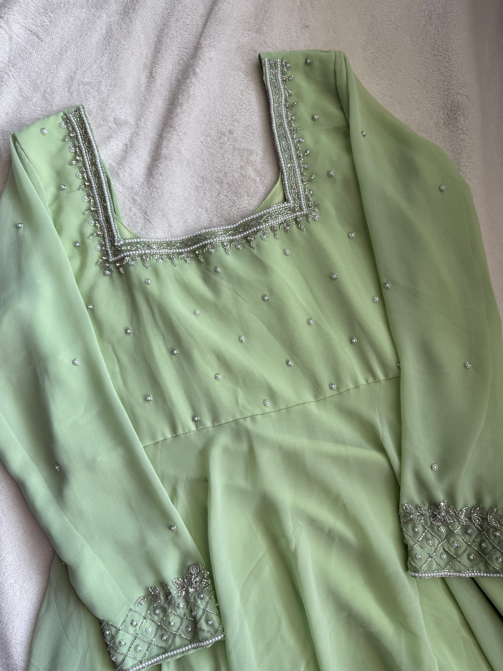 Pista green maggam work georgette heavy flare anarkali tunic
