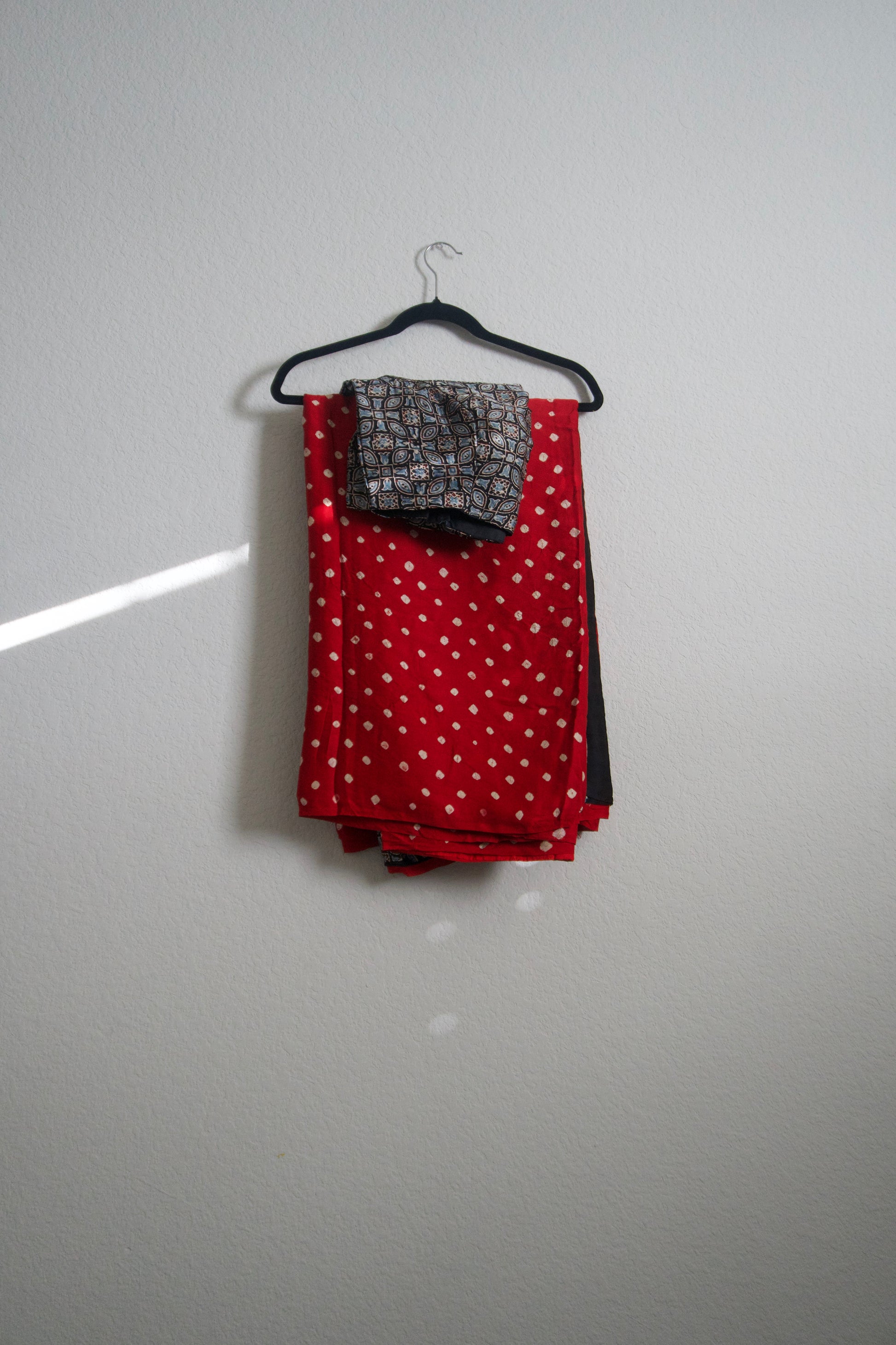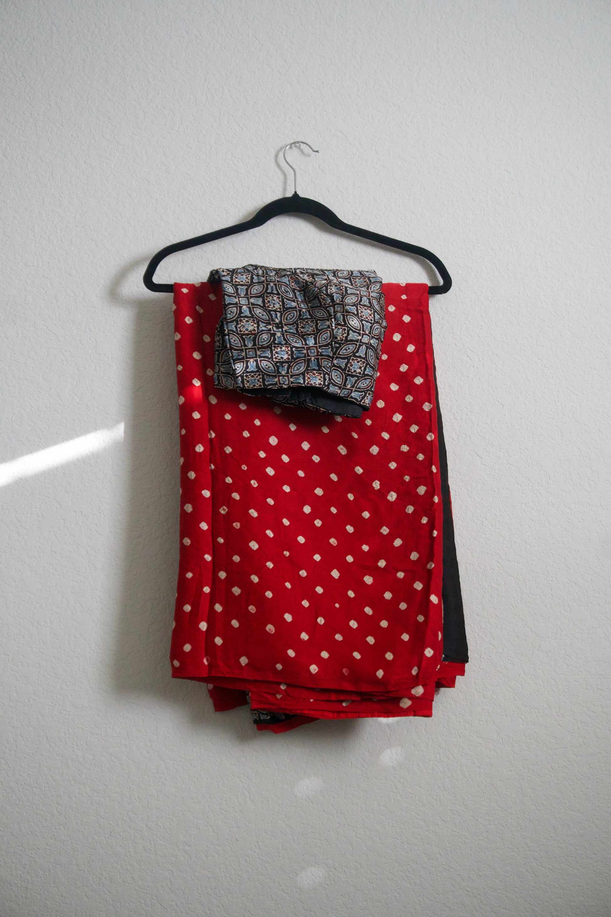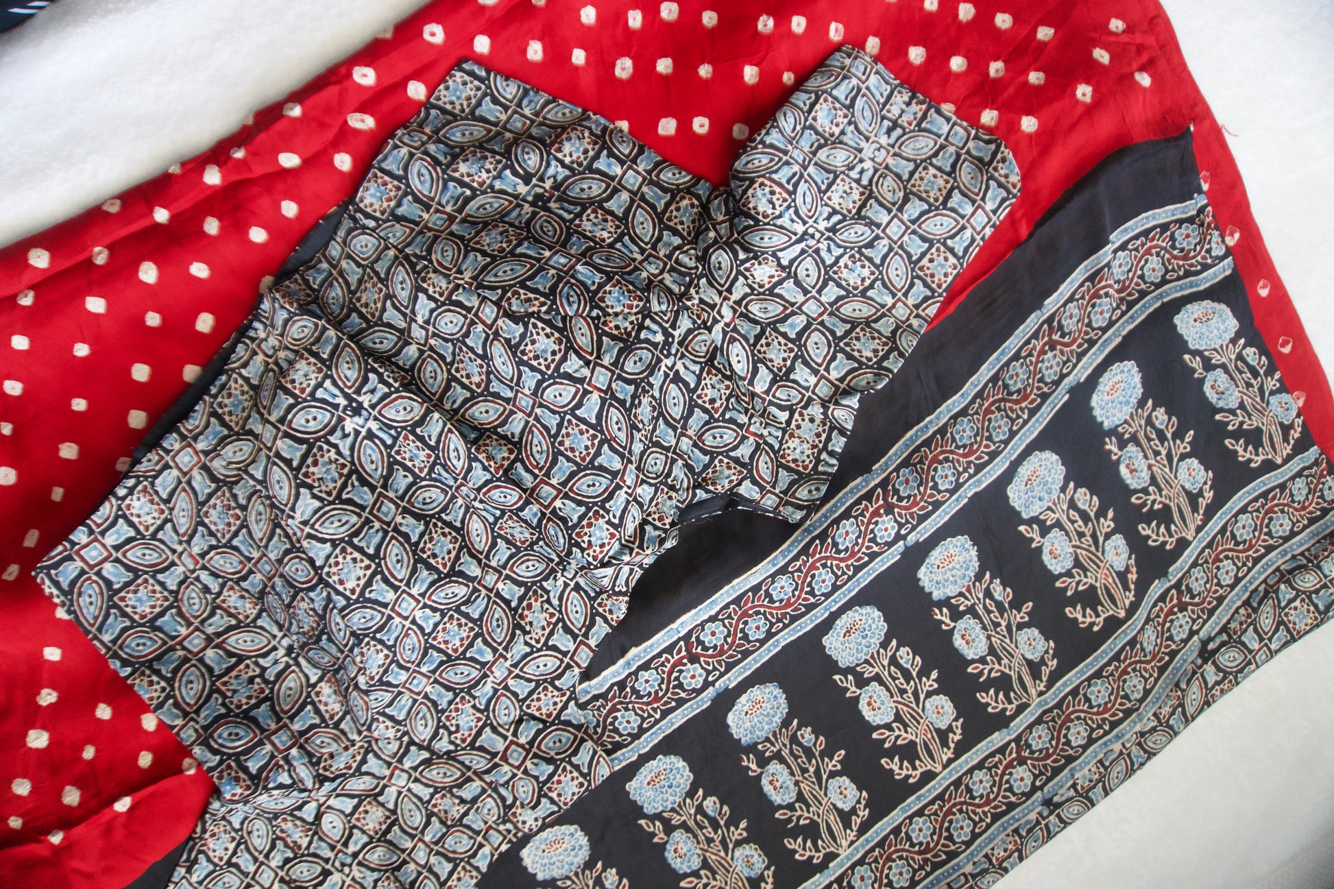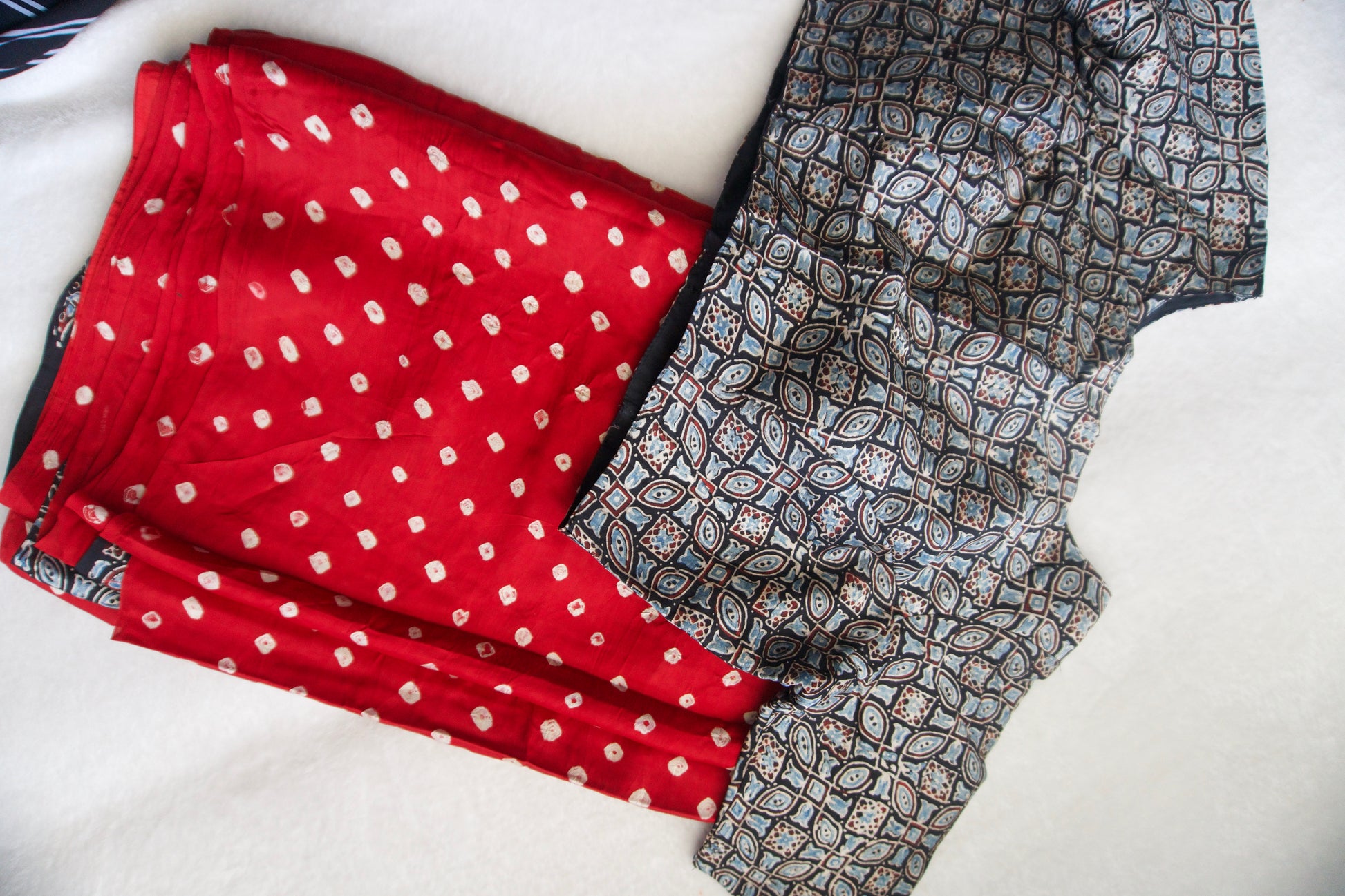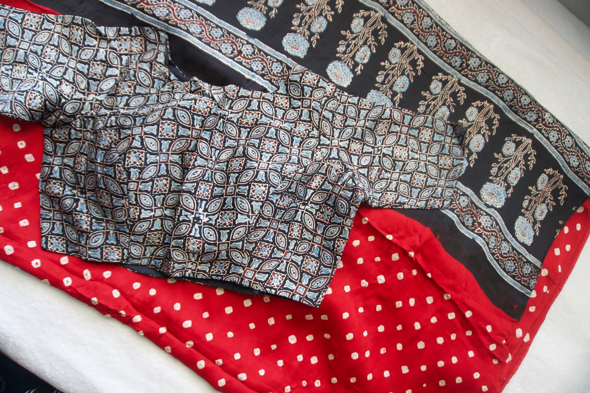Red Modal Silk Bandhini Saree with Black Ajrakh Blouse