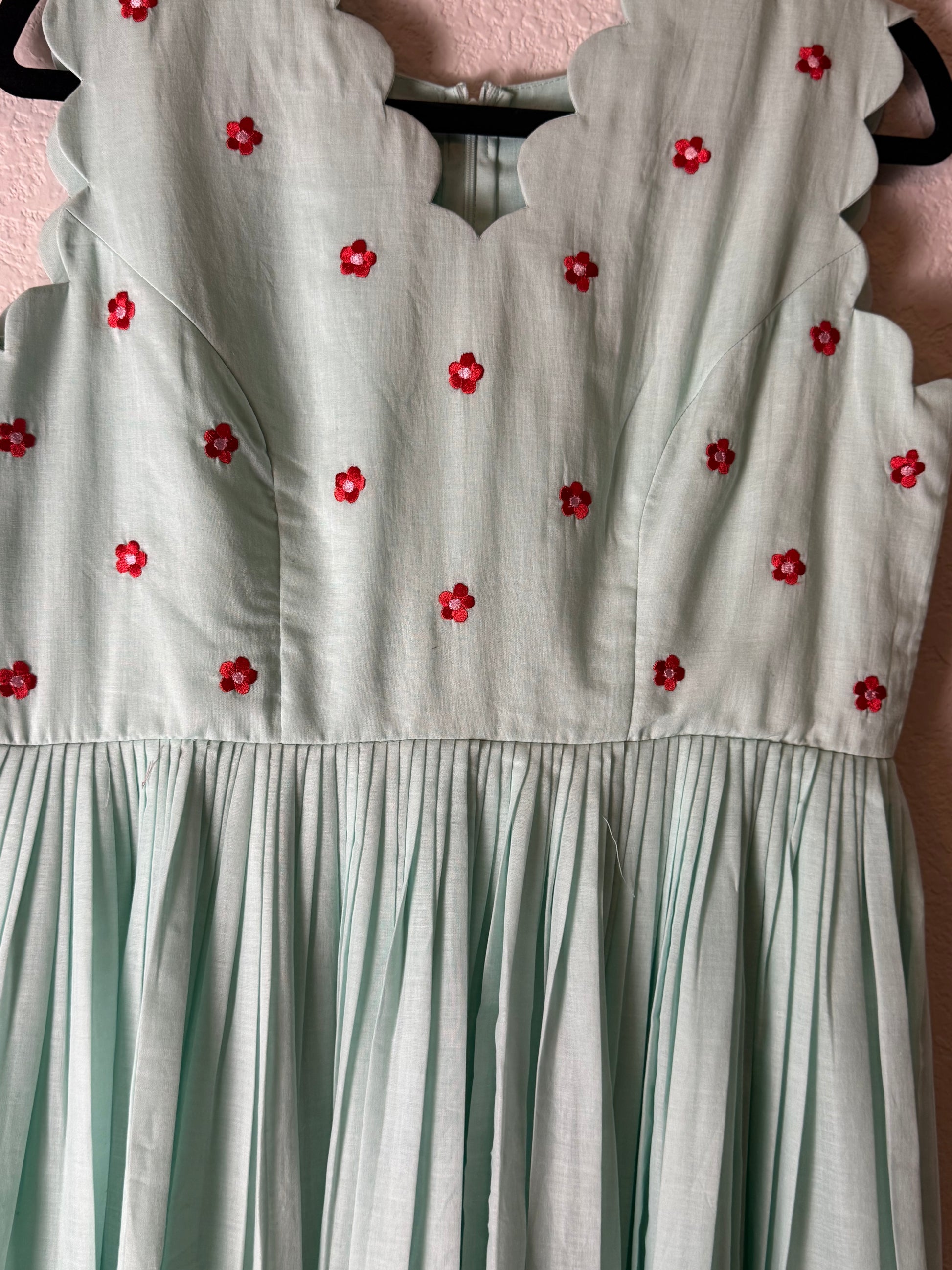 Sea Green Mul Cotton Scalloped Sleeveless Dress