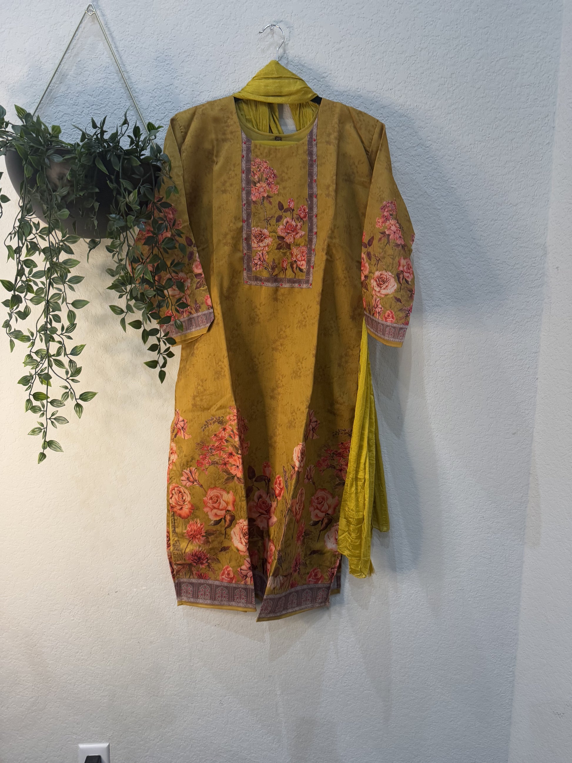 Yellow mustard muslin kurti set with floral design and chiffon duppatta